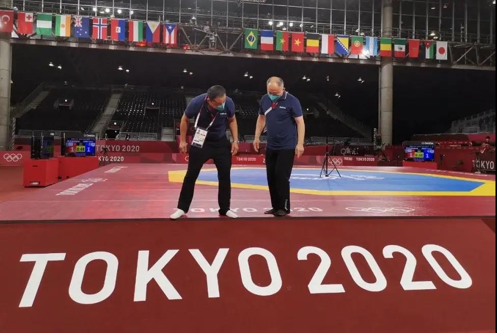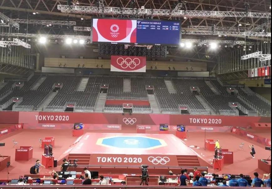 2021年7月20日,日本武道馆——奥运会柔道比赛场地。PG电子·(中国)官方网站体育东京奥运会服务保障团队正在布置、安装柔道器材
